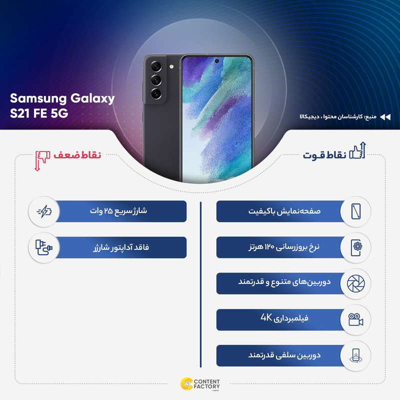 سری FE گوشیهای هوشمند سامسونگ با توجه به بهره بردن از مشخصات فنی مناسب و قدرتمند و البته قیمتی مقرون بهصرفهتر به نسبت پرچمداران این شرکت، طرفداران بسیاری زیادی دارند و توانستهاند عملکرد بسیار خوب و قابل قبولی را بهنمایش بگذارند. سامسونگ Galaxy S21 FE 5G به عنوان یکی از این محصولات سامسونگ شناخته میشود و در کنار قیمتی معقول، از مشخصات فنی قابل توجهای هم بهرهمند است. در نمای روبهرویی این گوشی از صفحهنمایش با ابعاد 6.4 اینچی با رزولوشن 1080×2340 پیکسل از نوع Dynamic AMOLED 2X قرار گرفته است و به وضوح میتوان این صفحه نمایش را یکی از برترینها در بین گوشیها هوشمند لقب داد. همچنین، این صفحهنمایش به تراکم 403 پیکسل به ازای هر اینچ و حداکثر نرخ بروزرسانی 120 هرتز مجهز شده است و طبعاً در این زمینه عملکردی معادل یک پرچمدار را خواهد داشت. در قسمت پشتی این گوشی یک سنسور دوربین اصلی با رزولوشن 12 مگاپیکسل و گشودگی دریچه دیافراگم f/1.8 در کنار سنسور 8 مگاپیکسل از نوع تلهفوتو با قابلیت زوم سه برابری اپتیکال (زوم بدون کم شدن کیفیت) و سنسور 12 مگاپیکسل از نوع فوق عریض (ultrawide) با زاویه دید 123 درجه، سنسورهای دوربین سهگانه سامسونگ Galaxy S21 FE 5G را تشکیل میدهند. برای دوربین سلفی این گوشی هم سنسور با رزولوشن 32 مگاپیکسل از نوع عریض در نظر گرفته شده است. در بخش مشخصات سختافزاری در نظر گرفته شده هم این گوشی با دست پر وارد میدان رقابت شده است. حضور پردازنده اگزینوس 2100 5G سبب شده تا سامسونگ Galaxy S21 FE 5G به راحتی توانایی اجرای بازیهای سنگین مثل کالآفدیوتی موبایل و آسفالت 9 را داشته باشد. از طرفی این پردازنده توانایی پشتیبانی از شبکههای اینترنتی نسل پنجم یا همان 5G را هم دارد. باتری با میزان ظرفیت 4500 میلیآمپرساعت و شارژر 25 وات مجهز به تکنولوژی شارژ سریع هم از دیگر مشخصات در نظر گرفته شده برای این گوشی هوشمند است.